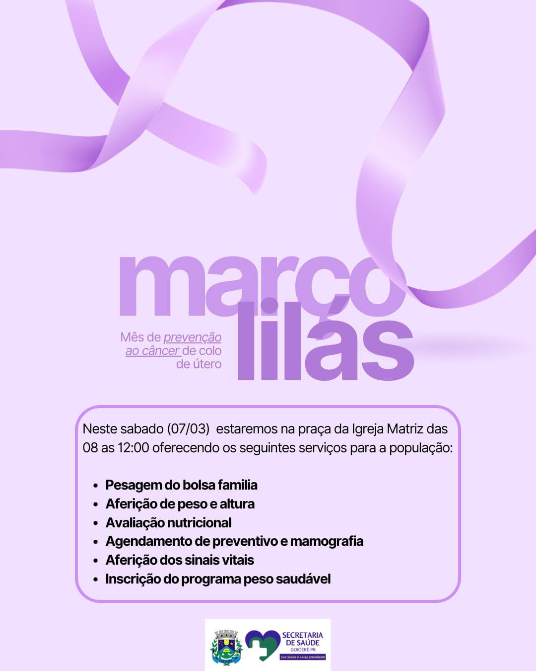 O Governo do Município, por meio da Secretaria Municipal de Saúde, realizará neste sábado (07), das 8h às 12h, uma ação especial em alusão ao Março Lilás, mês dedicado à prevenção e conscientização sobre o câncer de colo do útero. A atividade acontecerá na Praça da Igreja Matriz e contará com diversos serviços gratuitos voltados à promoção da saúde da população. Durante a ação, equipes da saúde estarão disponíveis para oferecer orientações e atendimentos básicos, reforçando a importância do cuidado preventivo e do acompanhamento regular da saúde, principalmente das mulheres. Entre os serviços que serão disponibilizados estão: Pesagem do Bolsa Família Aferição de peso e altura Avaliação nutricional Agendamento de exame preventivo e mamografia Aferição dos sinais vitais Inscrição no programa Peso Saudável A iniciativa tem como objetivo aproximar os serviços de saúde da população e incentivar a prevenção, fundamental para o diagnóstico precoce de diversas doenças. De acordo com a secretária municipal de Saúde, Jacqueline Tonelli, ações como essa são importantes para conscientizar e facilitar o acesso da população aos serviços de saúde. “O Março Lilás é um momento muito importante de conscientização sobre o câncer de colo do útero, que pode ser prevenido com exames e acompanhamento regular. Nosso objetivo é levar informação, orientação e facilitar o acesso da população aos serviços de saúde. Convidamos todos para participar desta ação e cuidar da saúde”, destacou a secretária. A Secretaria Municipal de Saúde reforça o convite para que a população participe da atividade e aproveite os serviços que estarão disponíveis durante toda a manhã.