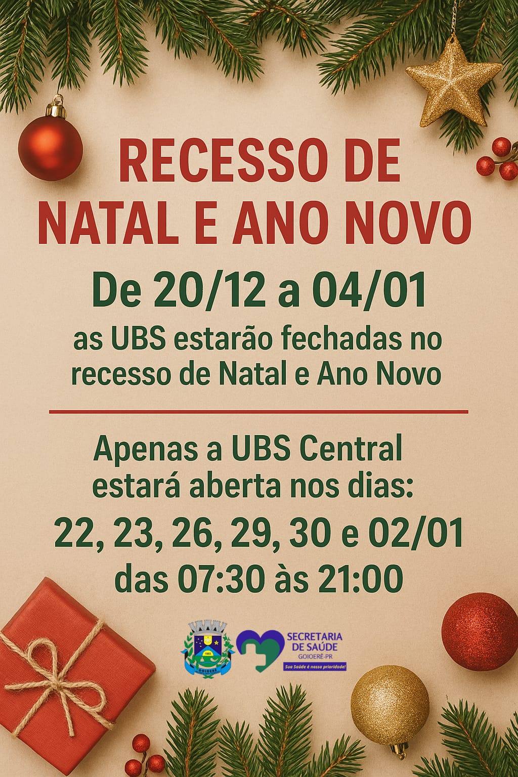 No período de recesso terá atendimento somente no posto central das 07:30 às 12:00 e das 13:30 às 21:00. Nos dias 22/12 , 23/12 e 26/12 29/12 , 30/12 e 02/01/26! Terão dois médicos clínicos gerais, pediatra e obstetra!