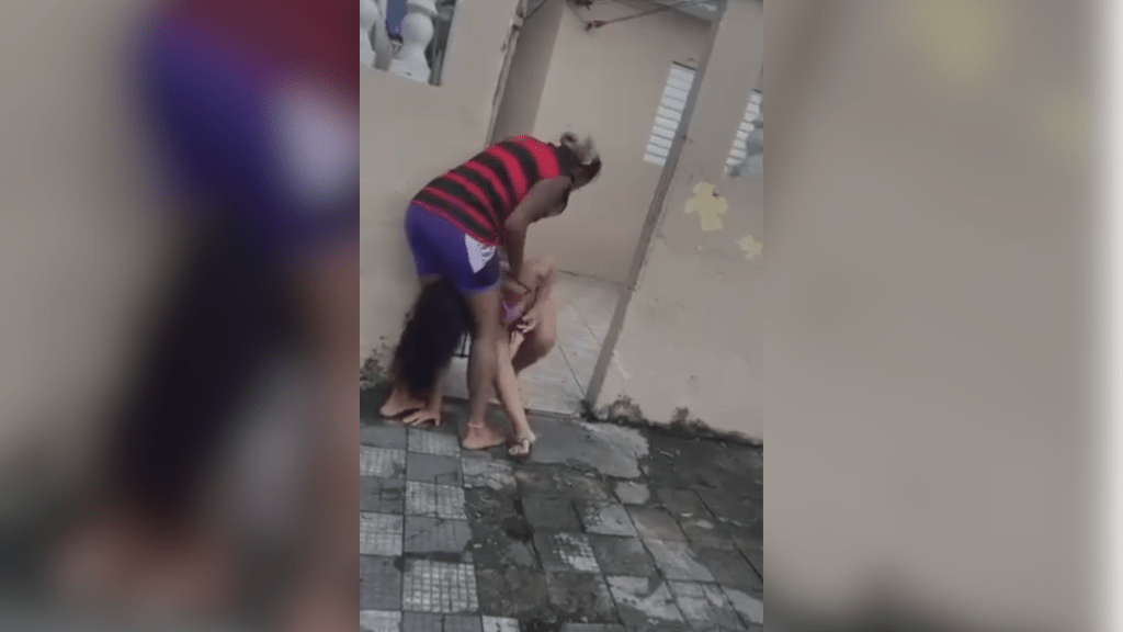 Na filmagem, é possível ver uma briga e uma sequência de socos no rosto. Mesmo caída no chão, a mulher não para de ser agredida.